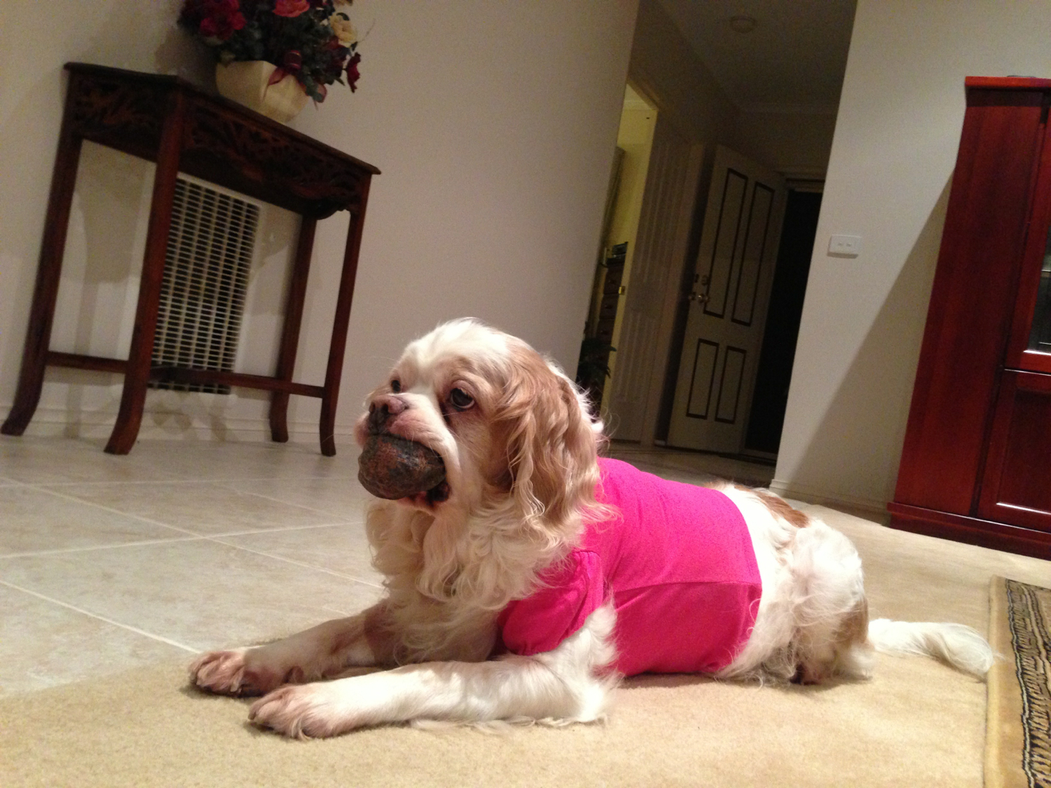 As for the dogs, Bethany is back on her solid food like nothing was wrong. It’s still too early to see if taking the teeth out has had any effect on her otherwise though. Then there’s Alvin. After wrapping him up in bandages all week to stop him from scratching at his stitches, we finally came up with the idea of putting a t-shirt on him. Now why didn’t we think of that earlier? He has spent the last few days strutting about in a childs t-shirt, which has worked a dream in stopping him from scratching. Just a shame that the only T-shirt we had in his size was bright pink. He didn’t seem to mind however.