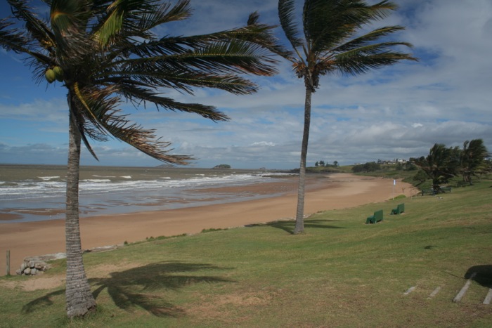 Following the crocodile farm, we took a scenic drive along the coast from Emu Park to Yeppoon, stopping along the way at the Emu Park Beach to take some photos of the choppy, turbid water. The recent weather has turned the waters a dirty coffee brown colour, and the stiff breeze that was blowing ashore today meant there was a consistent white topped chop breaking against the sands of the beach.