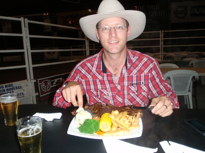 Arriving at the Great Western Hotel, we ordered our dinner. Bec a surf and turf, and me an 800gm slab of their finest rump steak. Sitting out at the tables lining the bullring, we dined on deliciously tender steaks, while watching cowboys ride the still living variety.