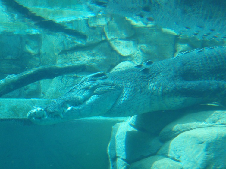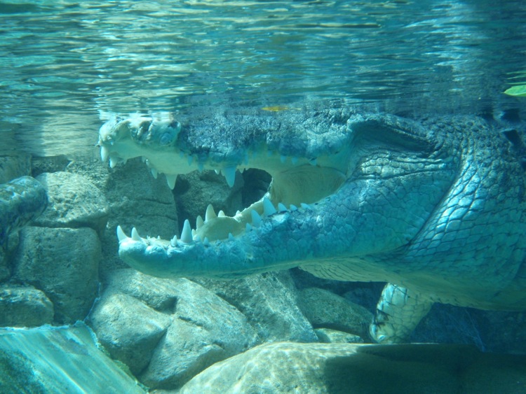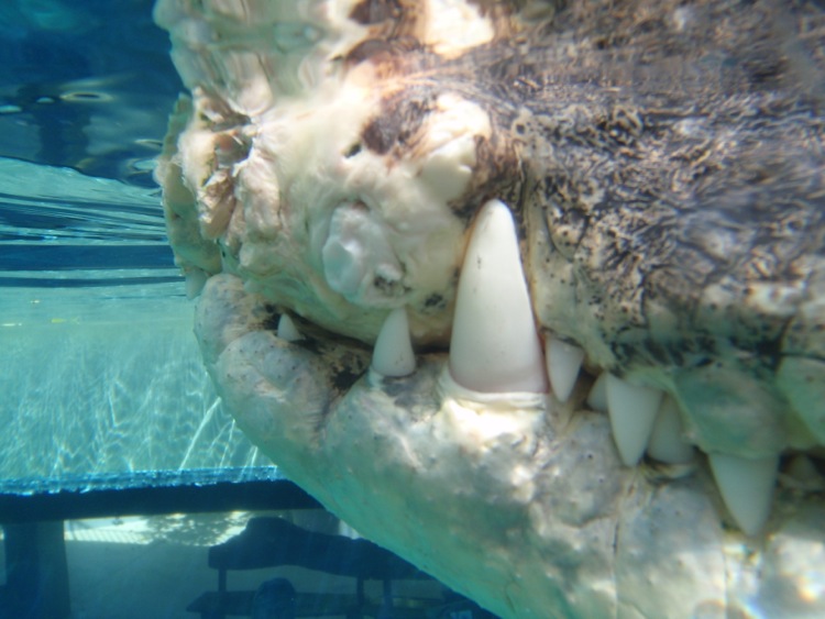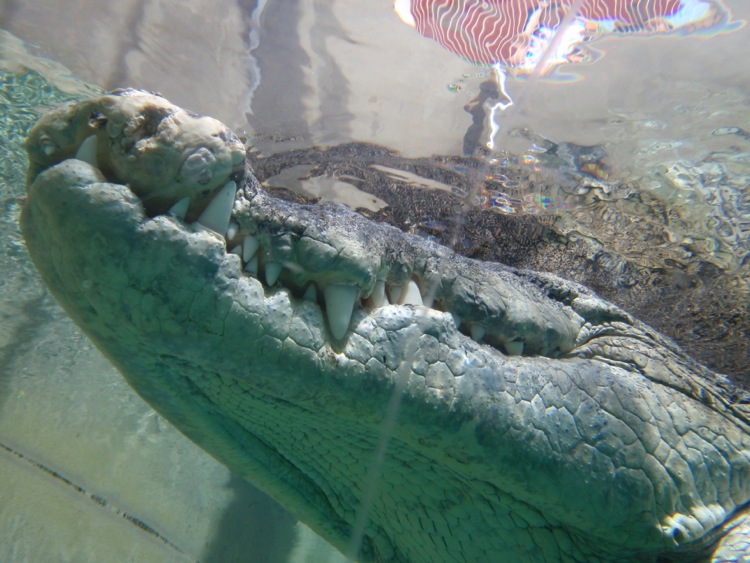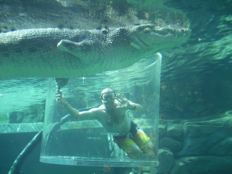 The cage, is then lowered into the chosen tank, and is maneuvered by the staff, in an effort to give you the best and closest look at the crocodile. A croc named ‘Chopper’ was chosen for my adventure, and despite him been swimming about earlier, I feared as I was lowered into the cool water that he was not going to be interested in me. He spent a few minutes sunning himself, just out of reach of my safety cage. Enticed with a couple of chunks of food from above, he was soon on the move, circling my enclosure, as I submerged myself and was able to get within an inch (the thickness of the plexiglass shield) of his ferocious fang like teeth.