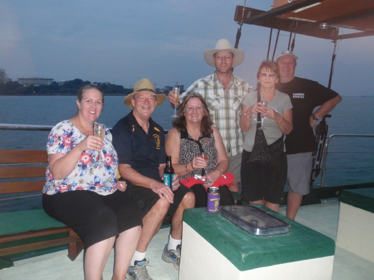 It was then time to return to the van, where we checked in on the babies, before part two of our day. A harbour cruise, on an old, two masted pearl lugger, which was timed to coincide with the setting on the sun. I say timed to coincide, as our efforts to show the rest of the gang a perfect Darwin sunset were again thwarted by a dense cover of cloud. Not that we allowed that to dampen our spirits, as we kicked off our shoes, and lounged about the open deck to enjoy a couple of pleasant hours drifting about the calm waters of the Darwin Harbour. Nibbles and a glass of champagne were provided to assist with our relaxation as we imagined the sun lowering itself below the horizon, beyond the banks of obscuring cloud.