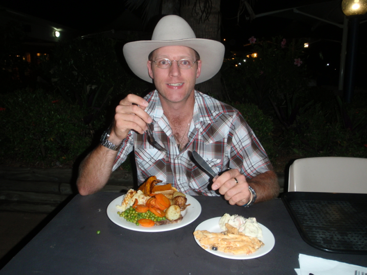 We figured that we would treat ourselves for our last night in Darwin. Heading back into the ‘outback’ we can imagine that the gastronomic treats might be limited to roadhouse burgers and fries for a while now. So it’s back to cooking for ourselves for a while I think. As for exercise, I did go for a bike ride yesterday, all the way from where I had it locked up at the back of the van, to the back of ‘The Beast’ to secure it for our onward journey. We are also doing a fair amount of walking. because everywhere we go, we have to park out in the boon docks to find a car park big enough. As for jogging with the dogs, we’d probably just slow them down. LOL. We’ll have plenty of time when we get home to get back into shape.