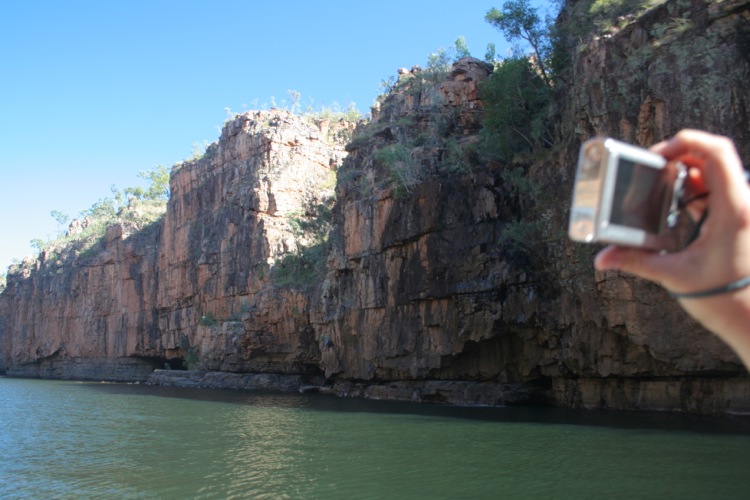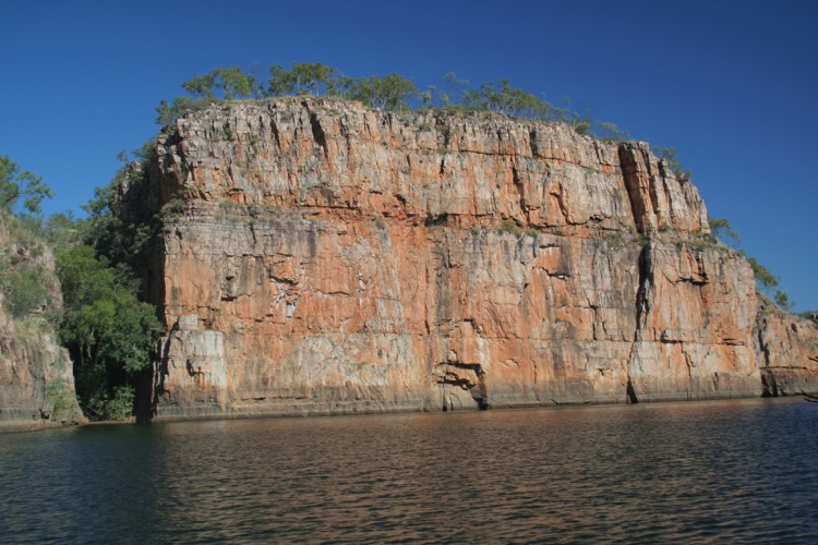 Like clockwork, at 9:00AM we were ushered down the jetty to the waiting wide, flat bottomed punt of similar size and description as that we had floated through Kakadu in. Along with about 60 other eager participants and a funny Kiwi guide we boarded and took up a position close to the bow as we pushed out into the first gorge. With the sun just poking its golden orb above the lofty escarpments that created the gorge walls, the water sparkled like a jewel encrusted satin ribbon wending through the landscape.