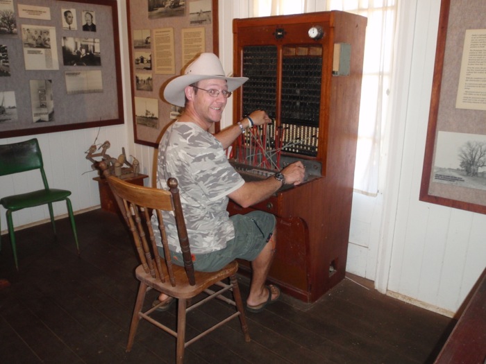 We still spent a good while wandering about the dusty displays, reading where we were able, the placards that had been carefully typed in an age before computers. Actually, the very typewriter upon which they were composed may have even been sitting proudly on display. The aviation gallery held an ancient looking air traffic control panel that had been removed from the Derby airport when Perth control took over the traffic control duties. In the communications gallery next door, an explanation of the Telstra microwave transmission system cleared up for me, the reason behind the many dish sprouting towers we have seen as we’ve been crossing the outback. They are used rather than over ground transmission wires, creating a network that is practically immune to adverse climatic events, providing outlying towns with a reliable landline telephone system.