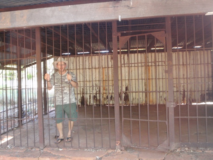 From the museum, after ensuring that we returned the keys for the next visitors to take advantage of, we stopped at the old Derby gaol. I have a keen interest in old penal complexes, but this must go down as one of the most basic, and savage I’ve been to. Literally a big steel cage, divided into two cells, with corrugated tin on one side and for a roof to give a modicum of shelter from prevailing weather, the steel rings were still embedded within the concrete slab, to which the prisoners were chained by neck rings and hand cuffs overnight. Designed originally to cater for the needs of about thirty inmates, it was known to hold up to 60 at a time, and for up to six months as prisoners awaited sentencing or transport south to Broome. As primitive as it seemed, it was constructed in 1906 and even more worryingly, only closed its iron cell gates to prisoners in 1975.