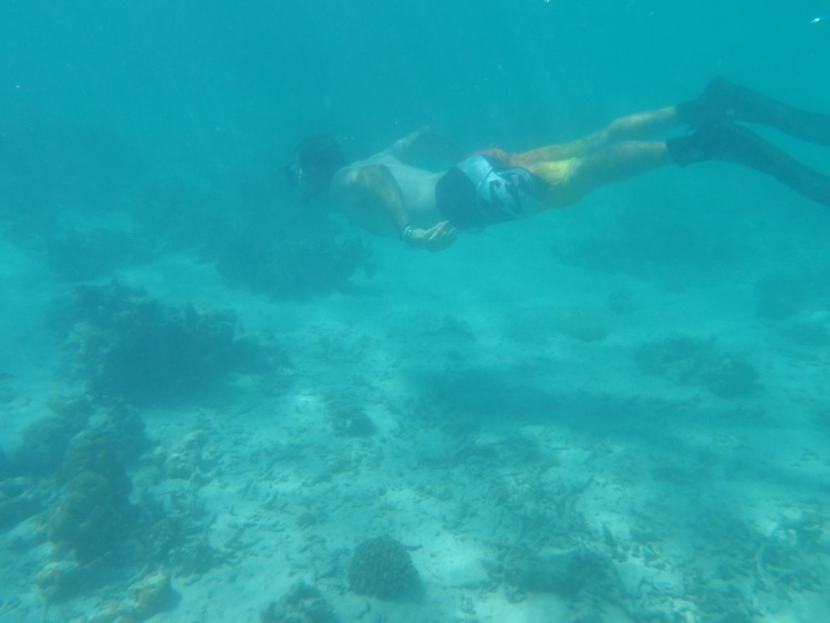 We spent about ½ an hour, drifting over the ever changing subterranean scenery, excitedly pointing out each new discovery, or diving down to chase fish around the coral branches, much to the amusement of Bec, before the chill of the water started to take the enjoyment out of it. Back on shore, as we struggled to detach our flippers from our feet, I was beginning to think that the water was actually quite warm as a cool breeze played across our wet torsos, causing a shiver and another near bout of hyperventilation.