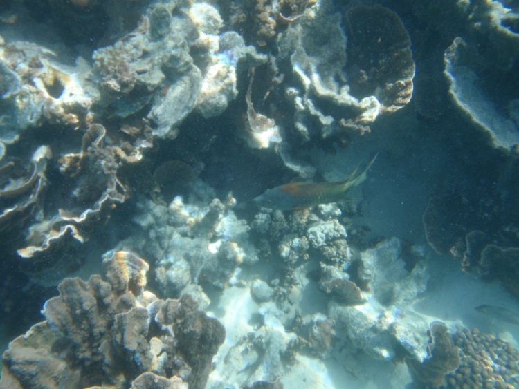 It was several minutes before I stopped struggling to breath, and was able to take in what was going on all around me. Below us, the floor of the ocean was a mixture of wide sandy patches and lolling coral reefs. A lot of the coral has been damaged, I would guess by indiscriminate swimmers, but there were great tracts of the hard coral in good condition to peer through the lenses of our masks at. Naturally, swimming in, around and about the coral was a huge range of colourful reef fish, from fingerling sized sprats, right up to some that would have been well over a foot in length. Everywhere you turned, there was another fish to see, swimming unconcernedly past.