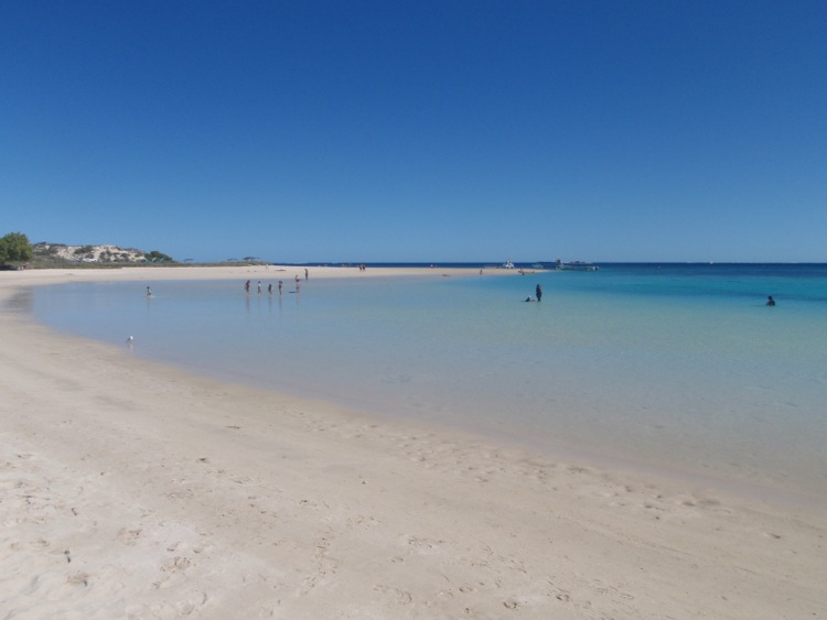 Apart from a couple of massive, but extremely busy caravan parks, what looked like a holiday resort and a few shops there is nothing here. We were actually going to turn around and head back to the main road, but a caravan parking spot opened up right in front of us. We took it be an omen, so I brought our meandering rig to a hasty halt. Because of the dunes, you can’t see the beach from the road or car park, so we entombed the dogs safely in the van, and took off on foot, cresting the low sand dune to be confronted by what can only be described as the most amazing beach I have ever laid eyes on. The sand was so white, it wouldn’t have looked out of place on the sterling salt mounds of Port Hedland. The powder like grains were spread out in a horseshoe, leading gently down to water ever so clear that the shallows were indistinguishable from the dry sand further up. The deeper the water got, the deeper the bright aquamarine hue the water took on, until it reflected the colour of the sky and took on a vivid dark tone of blue. Darker patches spread across the small bay concealed submarine coral reefs.