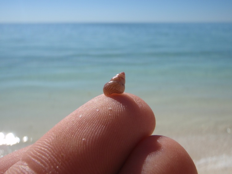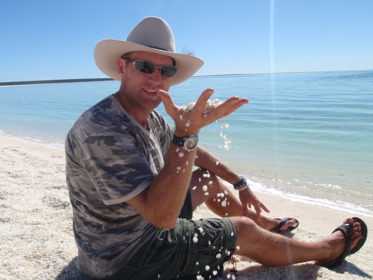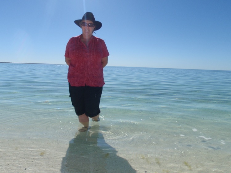 We then had another ¾ of an hour drive to our second planned stop, at ‘Shell Beach’. We first sat in the caravan for a bite to eat for lunch before making the short trek down to the beach. Unlike the shell beach at Exmouth, this is a true shell beach. Where you would expect to find sand, the ground is covered in millions of tiny little shells, all crunching noisily beneath your feet with each and every step. There are several hard packed shell dunes over which to clamber, before reaching the waters edge, where the shells are strewn loosely across the ground. Everywhere you look, these tiny little cockleshells form a sharp, crunchy beach. Despite the unusual ground covering, the water that gently laps the shore is of an indescribable clarity. It was of an almost similarly indescribable coldness, although wading in, its chilly effect was diminished as the extremities of our legs numbed to its influences.