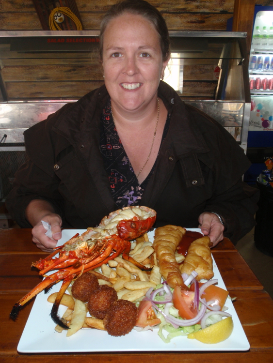 As well as cooked lunches there is frozen produce and souvenirs for sale. Tours of the factory are also available. I was interested in taking one of these tours, but due to the current conditions, only a single boat had been out this morning and regular factory functions had ceased for the day already. Instead, we salivated over the menu, before settling on a platter for two, which included a serve of chips, salad, a couple of bits of fresh fish, crumbed fish and lobster balls and the crowning glory, a half a lobster.