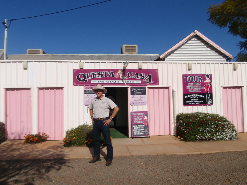 Father or not, Bec was treating me to a special fathers day treat next. She was taking me to a brothel. She was even going to join me. Not in the way you might be thinking though. Hay Street in Kalgoorlie is well known as a redlight district, which in its heyday hosted 18 bordellos. There are now only 2 and it seems that the oldest profession in the world isn’t quite enough to maintain their viability. So at 3:00PM each day, the 102 year old doors of last remaining original house, ‘Questa Casa’ are thrown open to allow the curious public to take a peek behind the windowless pink façade.