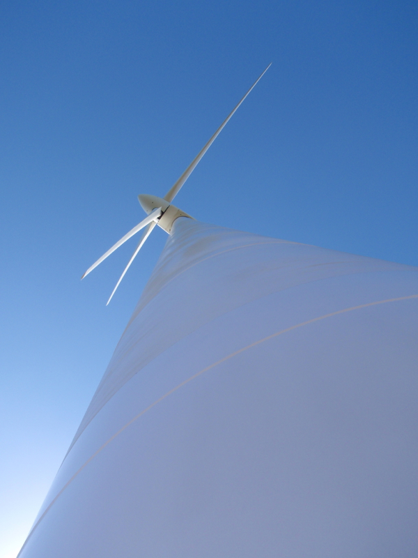 Standing tall, a power generating wind turbine seen from ground level.