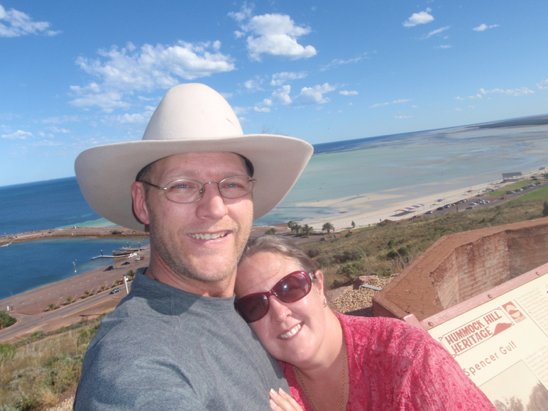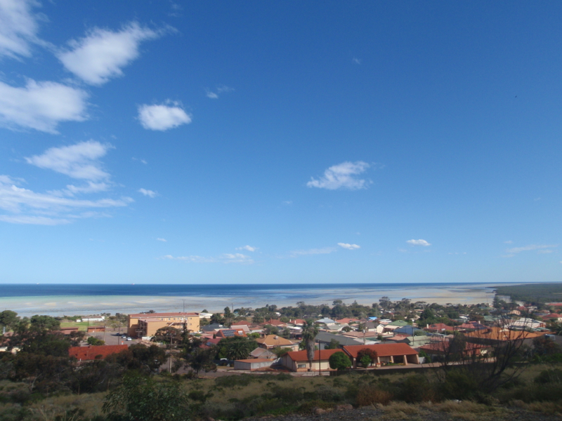 As we had envisioned, the view from the Hummock Hill Lookout was spectacular, the clear blue water of the Spencer Gulf extending out beneath us from the foreshore, where families were happily spending this unseasonably warm Saturday afternoon frolicking about on the sand or paddling, as we had done, in the water. Turning around by 90o we found ourselves looking over the dirty, dusty environs of the steelworks, while another ¼ turn provided panoramic vistas of the Whyalla township. Flies again accompanied our every move however, so it was difficult to relax and enjoy the views for very long, as our arms and hands were busily employed as makeshift fly swatters.