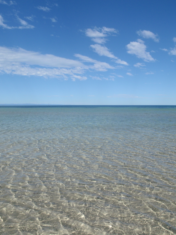 ‘Shazza’ had other ideas though as she again had a bit of a melt down on the short drive to the Hummock Hill Lookout, and we instead ended at the marina, looking longingly up at the hill, but with no idea how to ascend it. The road here ran out at a delightful looking, calm watered swimming beach, but there was certainly no path up to the lookout. Taking our cue from the weather, which had by this stage hit a high of a little over 30oC, we parked ‘The Beast’ and wandered down to the small crescent of golden sand, where we paddled out into the cool water. With the hot sun on our backs, the rippled surface of the transparent water on our legs, the only detriment was the constant swarming of flies aggravating our senses as they buzzed busily about us, crawling ticklishly and annoyingly across our faces.