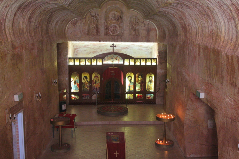 Our reason for being lost out in the ‘badlands’ was that we had gone off in search of another underground church, this time the Serbian Orthodox Church. Considered to be the prettiest, the grandest, the largest and as it turns out the most expensive of all the beneath ground level churches in Coober Pedy, if you were to visit only one church while here, this would be it. From the outside, it looks nothing special, just a few doors and windows cut into the side of a hill. It is once you get through the door, after pushing your requested $5.00 per person donation through the slot of the honesty box under the threat of being on camera, that you get to see what an ornate hole in the ground this really is. With beautifully sculptured effigies in the walls, the main gallery is a wide open space with a timber and lead light glass frieze beyond the altar. Lit from behind, it sparkles in the dimly lit room. A mezzanine level gives sweeping views of the entire space.