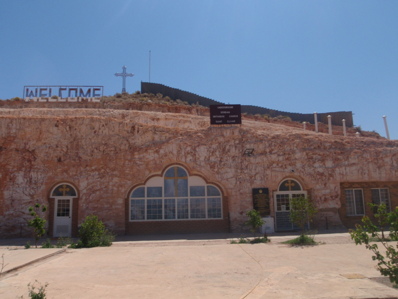 The Anglican Catacomb Church was next, which is a much plainer house of worship. It’s simple layout is as a result of it being converted from existing dug out residences in the late 1970s, the main feature is twin Caldwell drill shafts that descend directly above the pulpit, the remainder of the church is simply adorned with a cross, lectern and communion table fashioned from local mulga wood and an old miners winch. The minister greeted us warmly when we entered, even taking on the roll of photographer to take some happy snaps of us. We soon slid back out though, when he began asking questions about our faith, leaving him to attend to the next family that were making their way down the aisle.