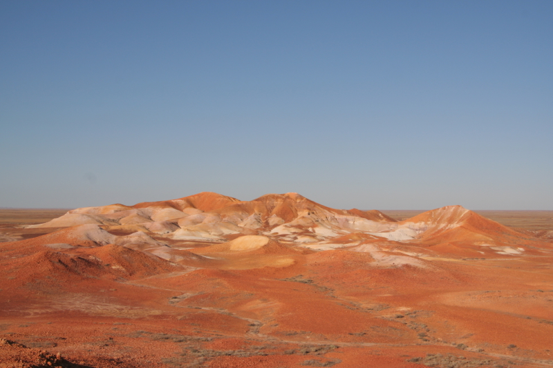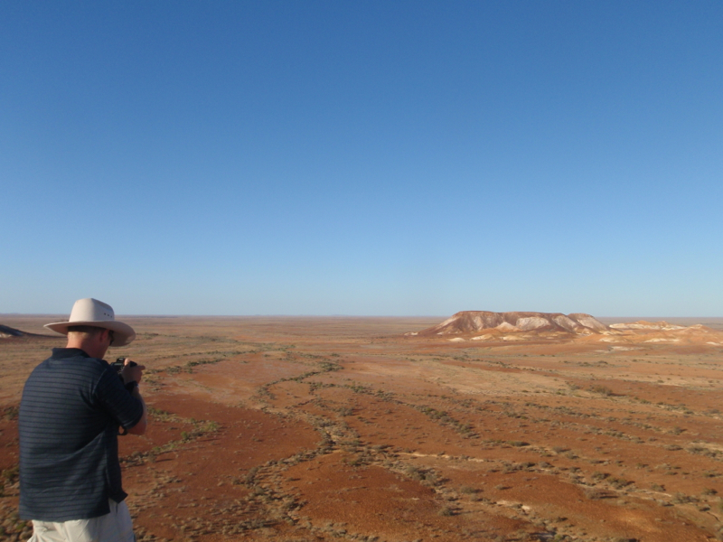 So called The Breakaways, because they have broken away from the nearby Stuart Range, the reserve consists of a low range, featuring flat topped mesas that slope down to wide expanses of gibber desert plains. A mixture of grey, red and white dirt causes an ever changing scenic vista. The 30Km drive along a dirt road that was comparably better than many of the highways on which we’ve travelled takes you past a section of the nearly 5,500Km long ‘dog fence’, before winding up towards two cliff top vantage points.