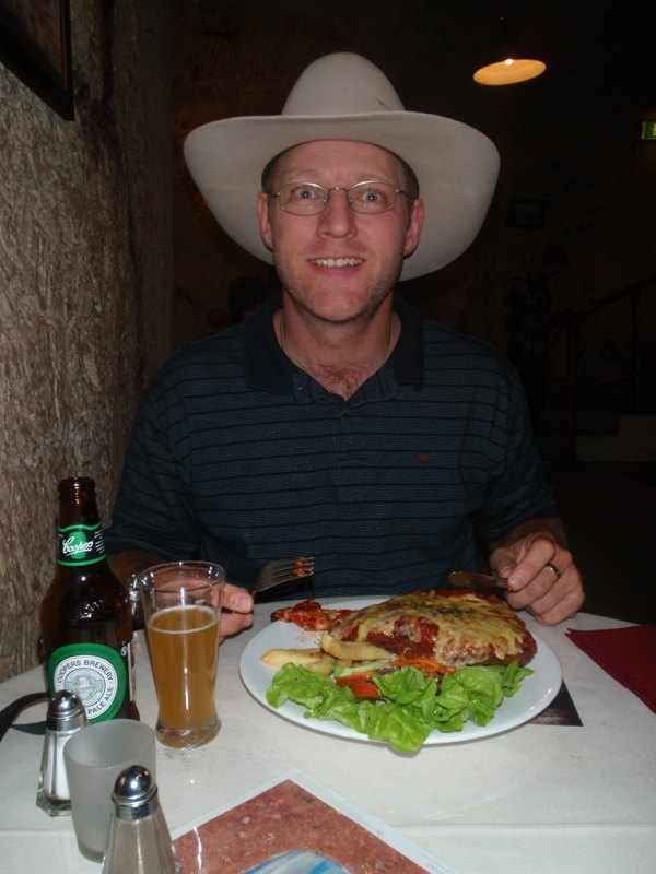 We were to be in luck too, as tonight it turned out was ‘parma’ night. Looking across the room to another couple of diners, the parmigianas indeed looked to be the goods, although everything listed on the short menu sounded delicious. We quickly ordered a chicken ‘parma’ each, then sat back reminiscing happily about the past five and half months as we waited for our meal. When our plates were delivered, we were to be surprised by the outstanding quality of the fare, which I would put on an equal, if not better, standing than the parmigiana that I raved about in Port Lincoln the other week. Coupled with the uniqueness of sitting deep within the bowels of the earth, it was one of the better meals out we’ve enjoyed during our trip.