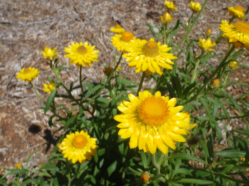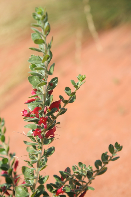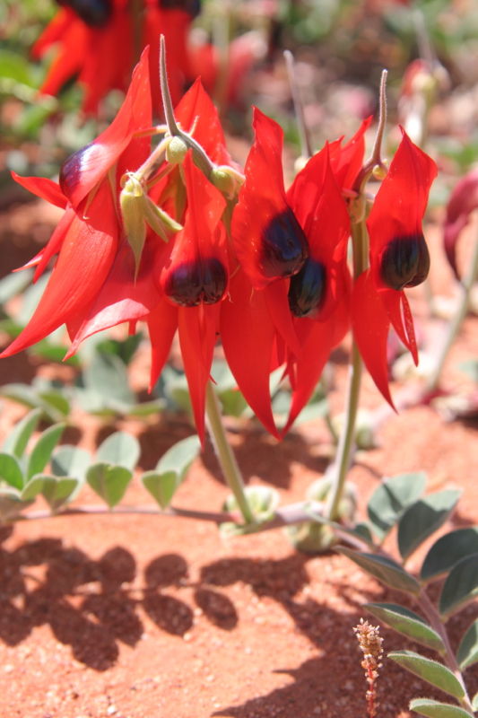 There was little rush, because we knew that we had only a short drive to endure, enroute to our campsite for the night, following our time in Port Augusta. Therefore, after a good investigation of the gift shop, we slowly ambled along one of the defined walking paths through the gardens, taking in the whole scene stopping often to prod, sniff and photograph all of the interesting plants. For over an hour, both Bec and I could be found, mostly hunched down on our hands and knees, focusing cameras on some of the delicate flowers that were blossoming. Among them were several specimens of our all time favorite, the Stuart Desert Pea, its distinctive red and black flower easy to pick out.