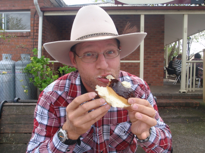 We left the dogs to guard ‘The Beast’ while we walked from one end of the lengthy main street to the other and back. Lunch was to consist of genuine giant German bratwurst sausages, but we came to a bakery selling a delectable choice of sweet treats. It was still too early for lunch, so instead we decided to stop for a little morning tea. Before we knew it, we were struggling our way through slabs of vanilla slice and cream and jam filled doughnuts, while sipping on thick, sickly sweet hot chocolates, made from rich lashings of melted chocolate. Lunch plans I think pretty much went out the window as our stomachs struggled to contain our morning tea.
