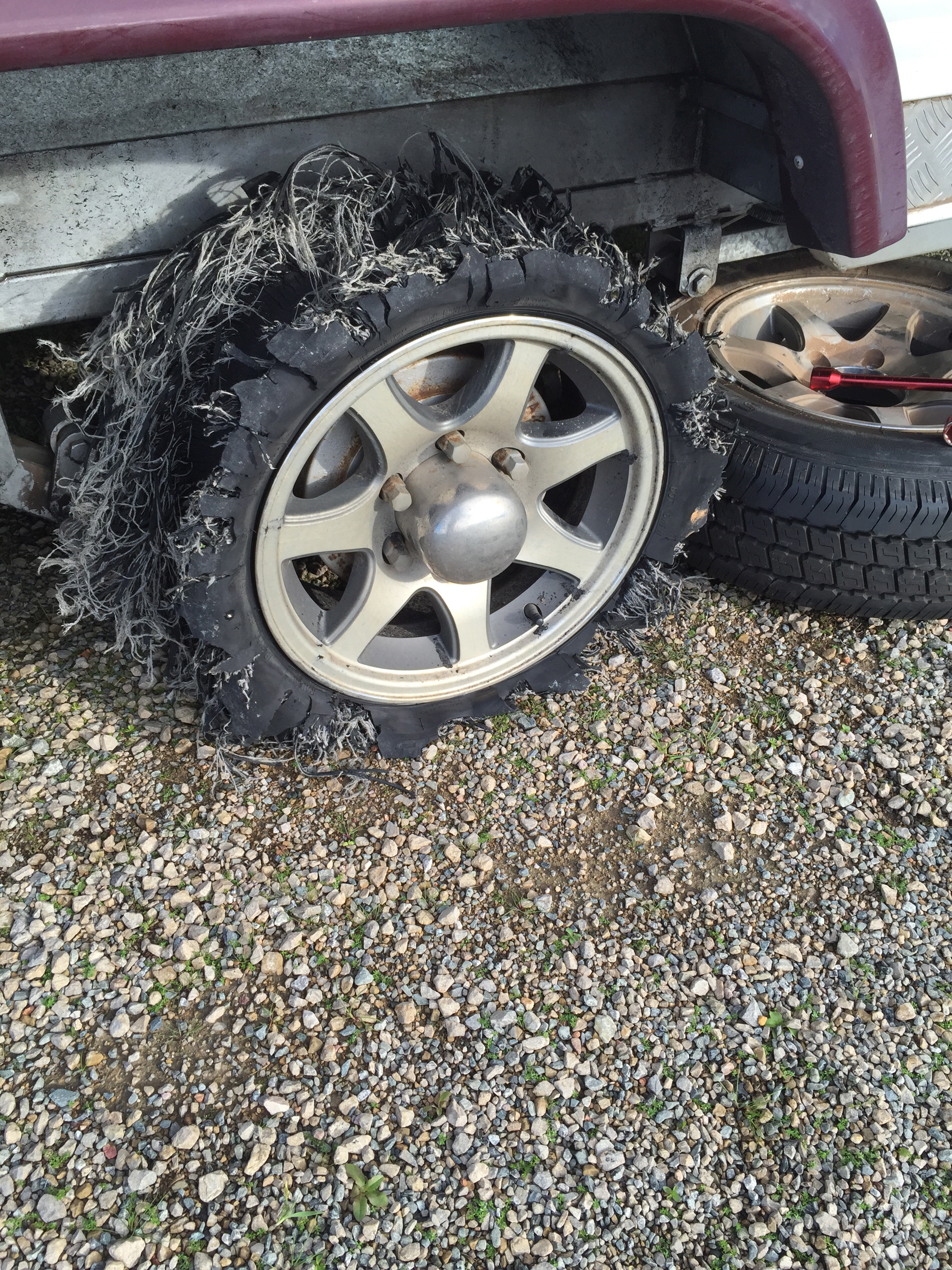 I pulled to the side of the road, perching precariously on the soft shoulder, thankful that I had just yesterday confirmed that the jack I have for years been carrying in the van is actually competent at hefting the ‘tin can’ far enough into the air to change a tyre. Getting out to survey the damage, I found the front tyre on the drivers side of the van looked a little worse for ware. That is to say, there were barely two narrow rings of rubber preventing the rim from gouging divets into the road surface, the edges of what was left of the rubber shredded to wispy tassels. An inspection of the undercarriage showed that we had gotten off lucky, with no other obvious damage.