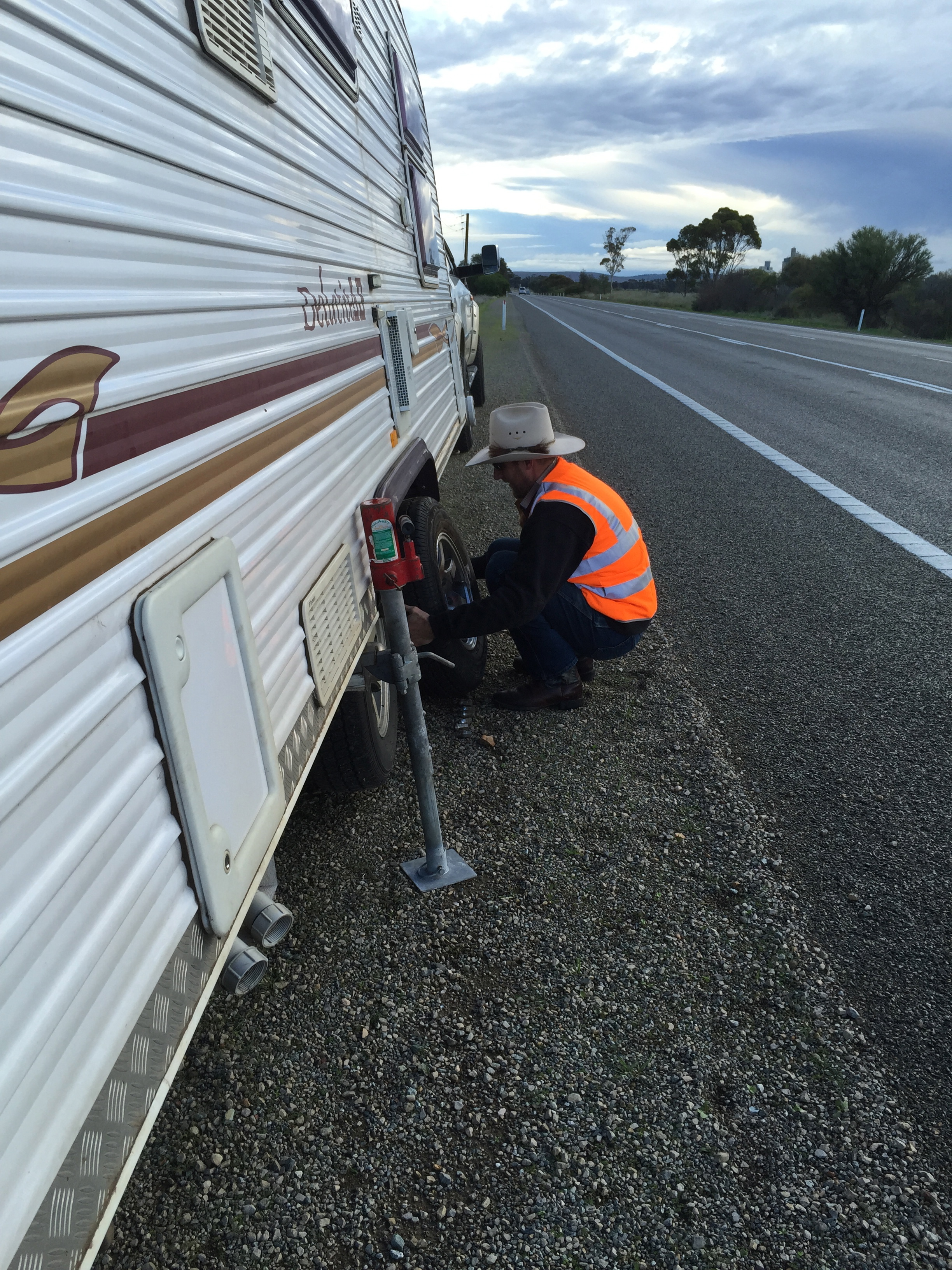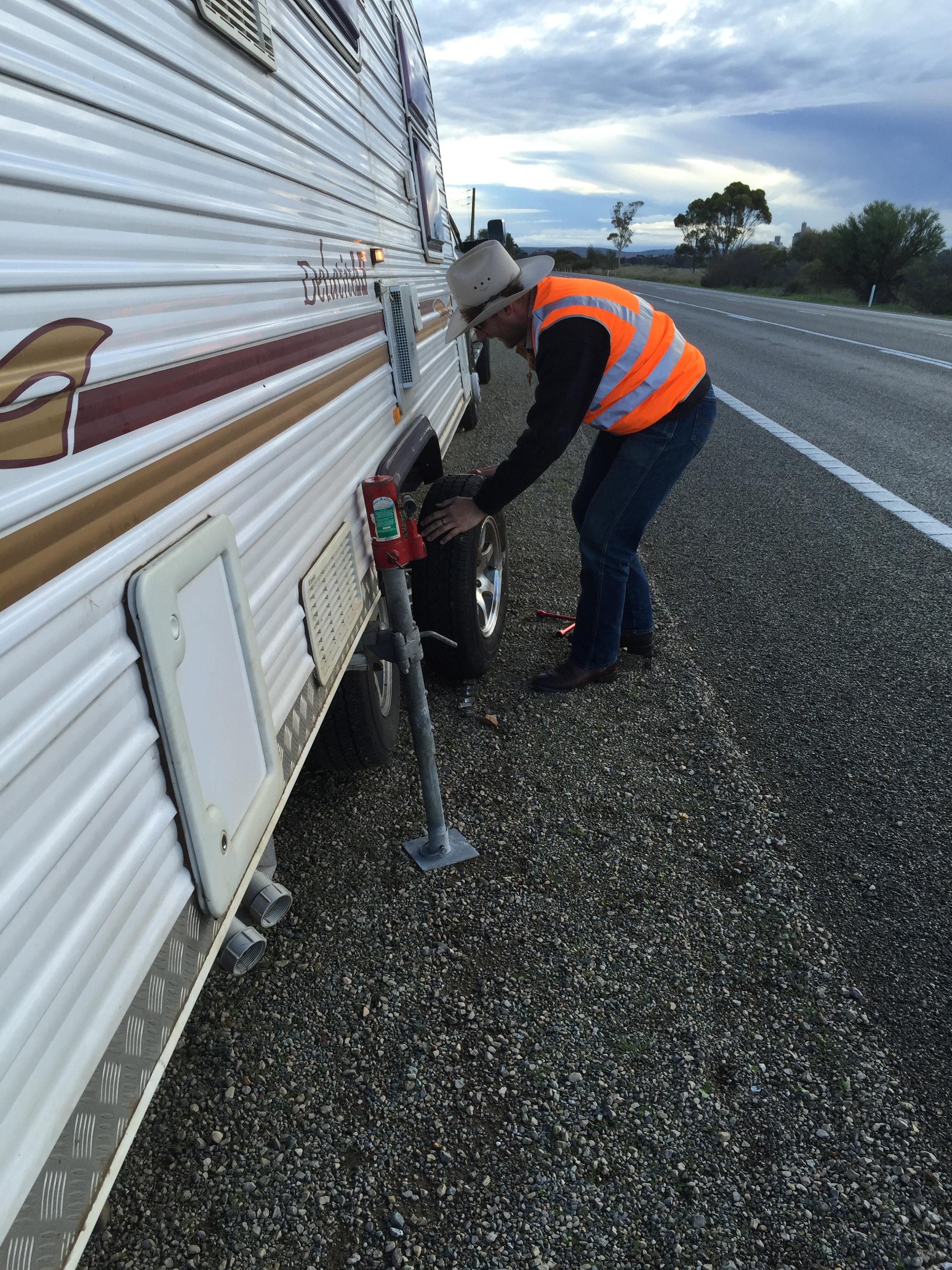 Whilst it wasn’t an overly difficult task to swap out the old tyre for the spare, it was a job that necessitated emptying the contents of both the caravan boot and the back of ‘The Beast’ in order to get access to the required tools to complete the task, all the while keeping a close eye on the cars and trucks barreling past at close quarters.