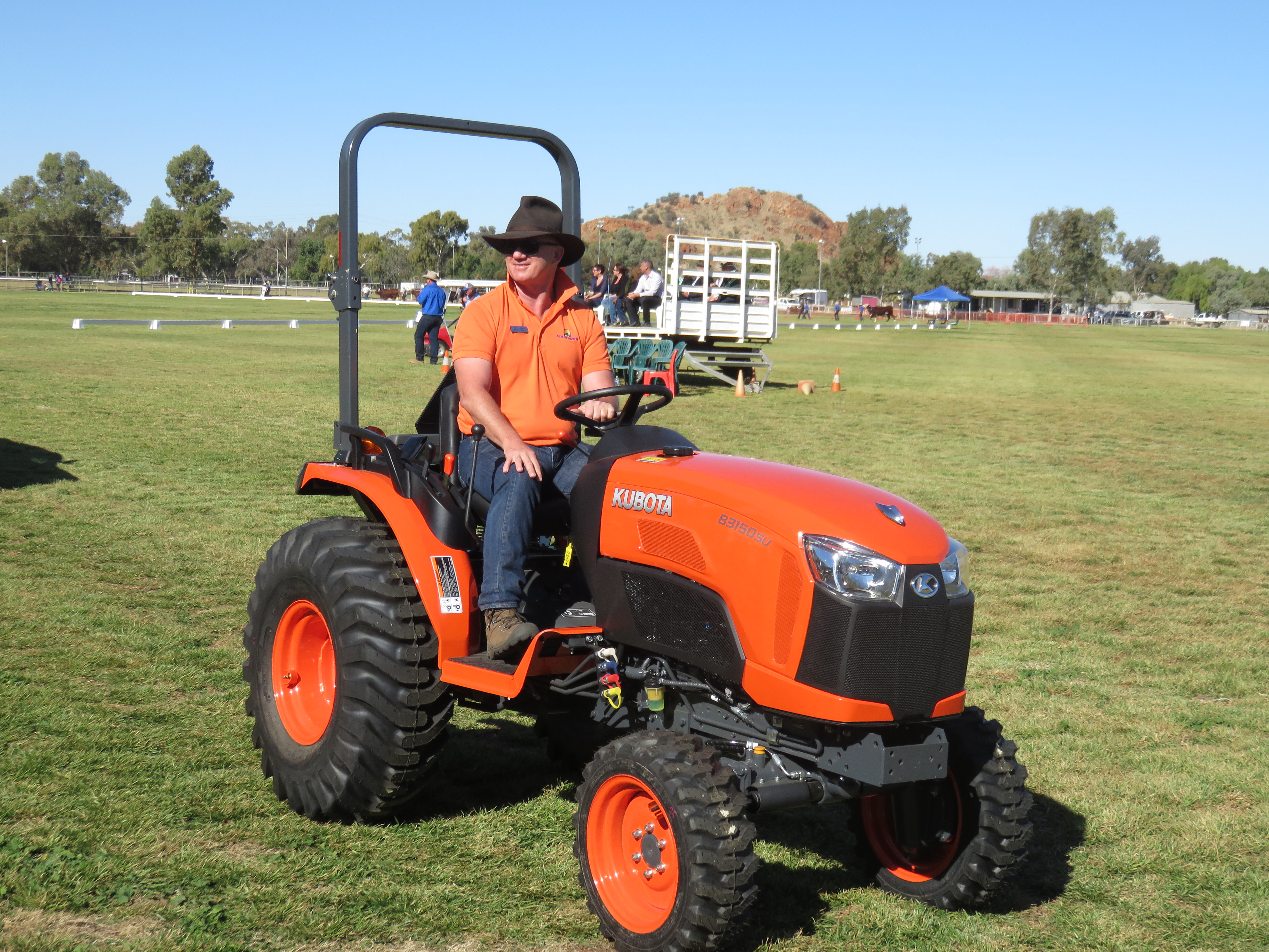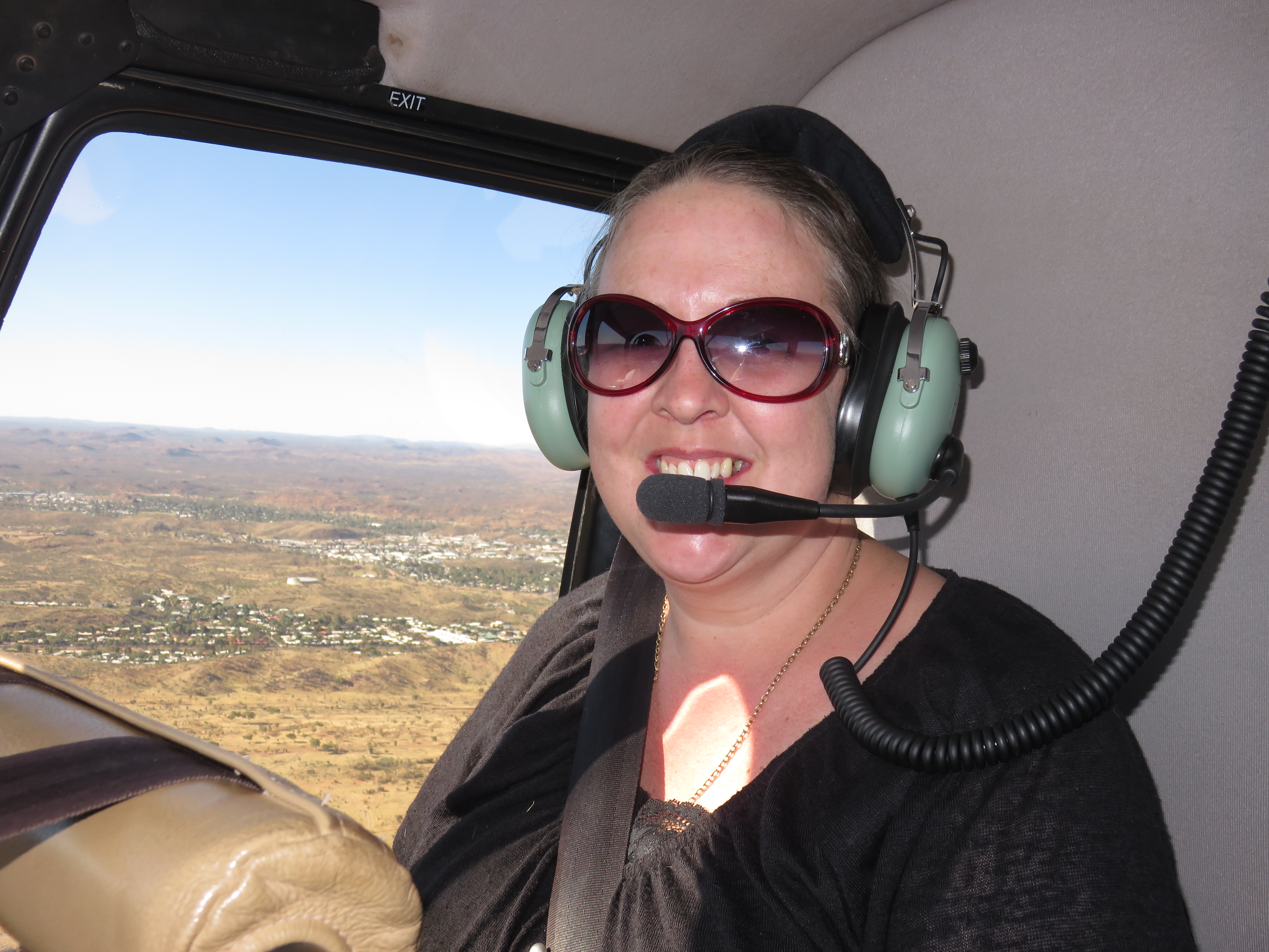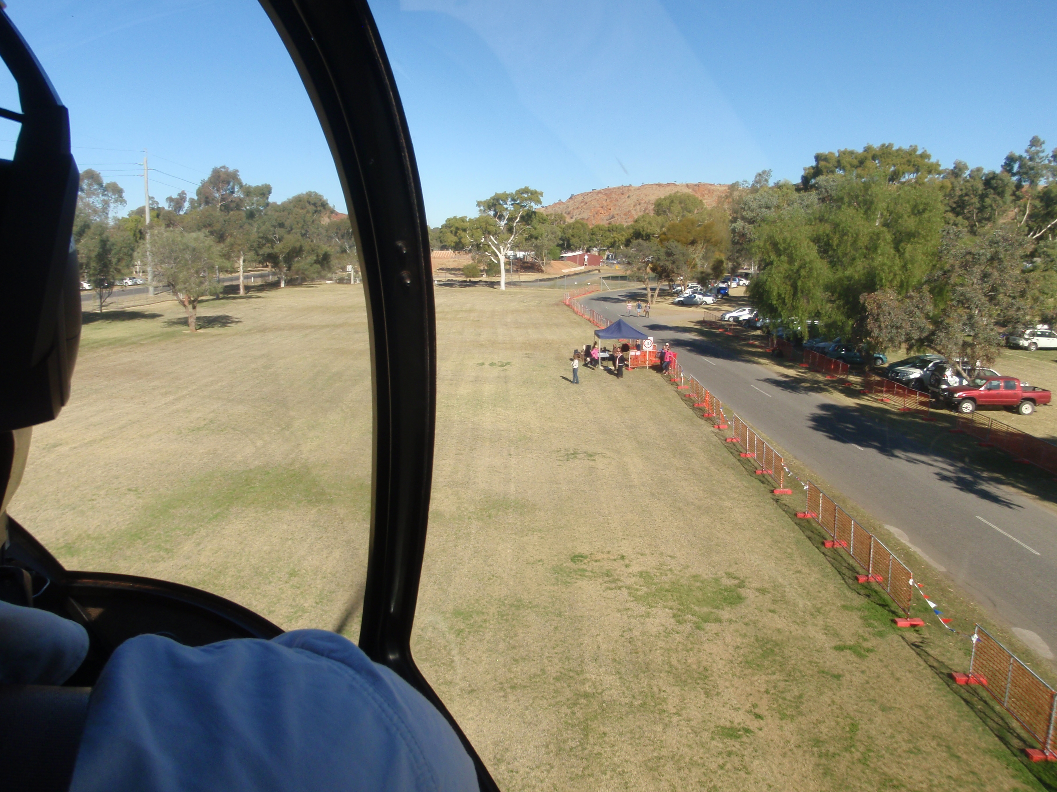 IMG_2045Our day at the show came to a conclusion with a brief joyride in a helicopter. Six minutes of airtime saw us soar high overhead of our caravan park, Mount Gillen and back to land softly and all too soon at the oval from whence we started. It was exhilarating, seemingly floating in the clear sky, just a gentle thump of the rotors cutting through the air above us audible through the sound deadening headsets.