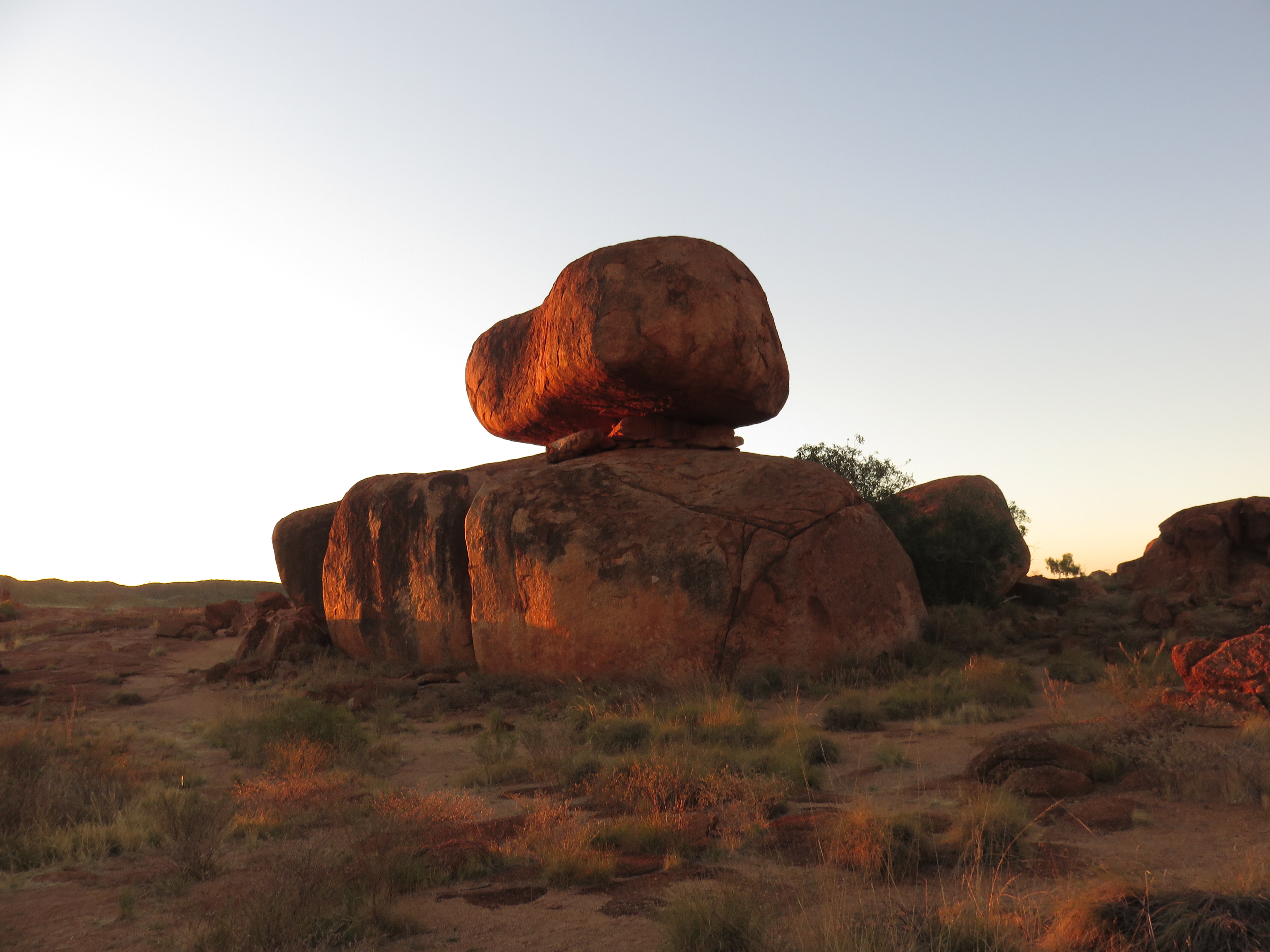 As the sun dipped beyond the distant horizon in yet another spectacular outback display of colours, we managed to find the two precariously balanced giant boulders that offer the archetypal image of the Devils Marbles. We can now add our own photographic interpretation to the no doubt millions of photos already floating around of these two most famous rocks.