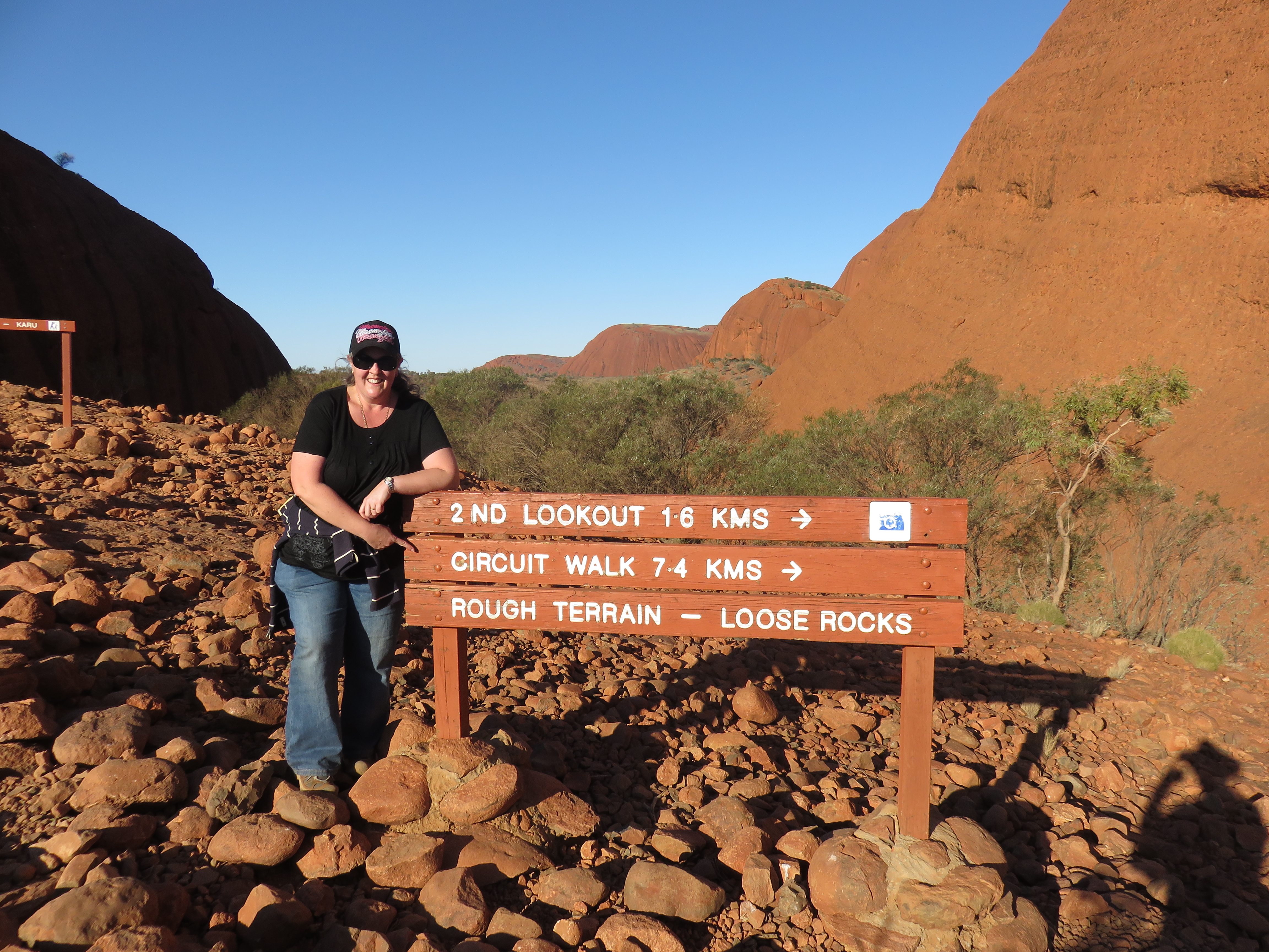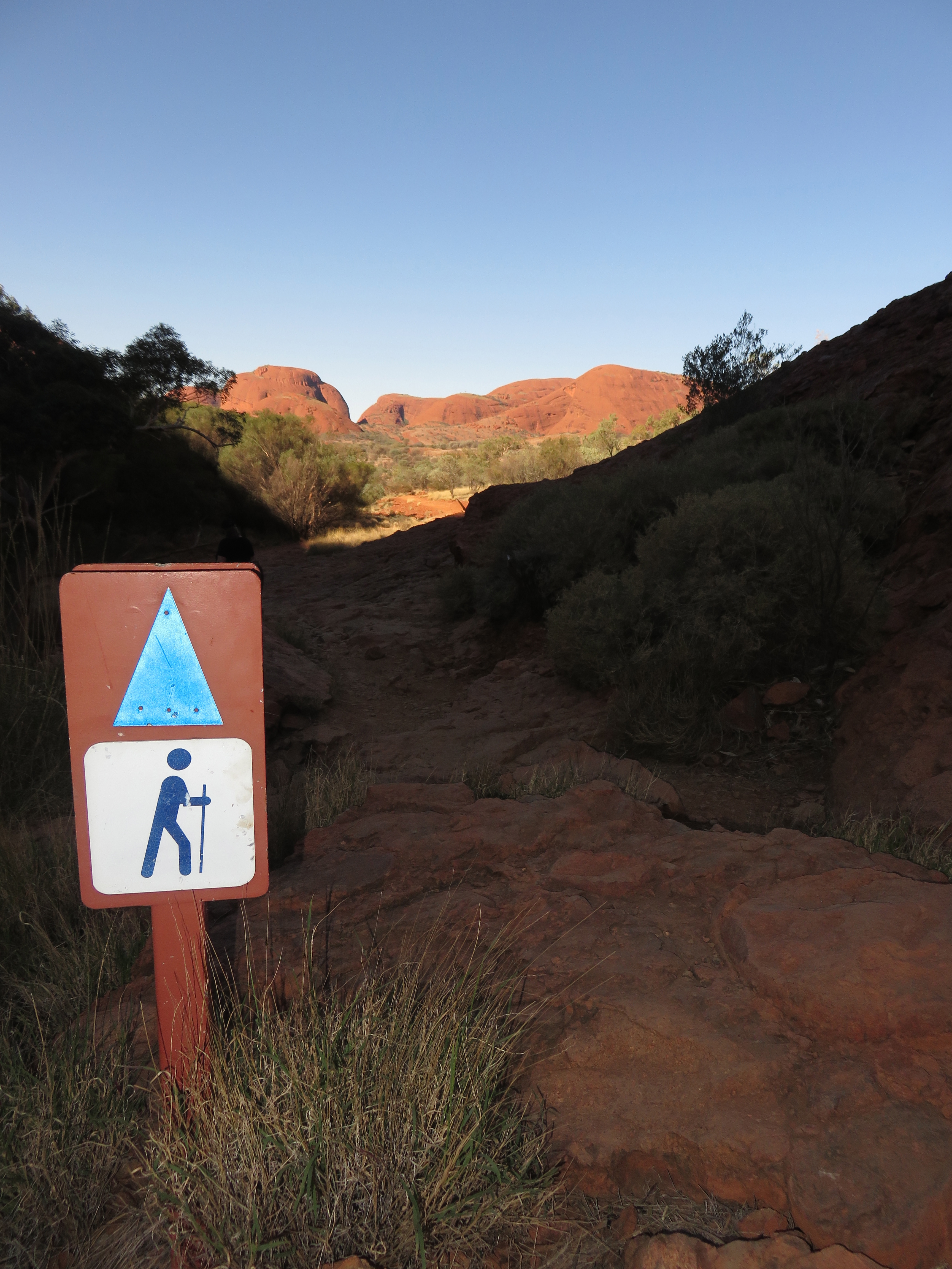 With that, we set off. There is a choice of several walks here, from the 2.2Km stroll to the Karu Lookout, to the 5.4Km walk that takes in both the Karu and the Karingana lookout, to the burger with the lot 7.4Km Valley Of The Winds full circuit that passes both lookouts, before descending to the desert floor for a trek around the base of the towering formations. This final walk was graded as being difficult, with a very rough and steep track and recommended for experienced hikers. Or so the sign said. We looked at each other as we passed by the information sign, deciding that having trekked 11Km around Uluru yesterday, we could now consider ourselves experienced.