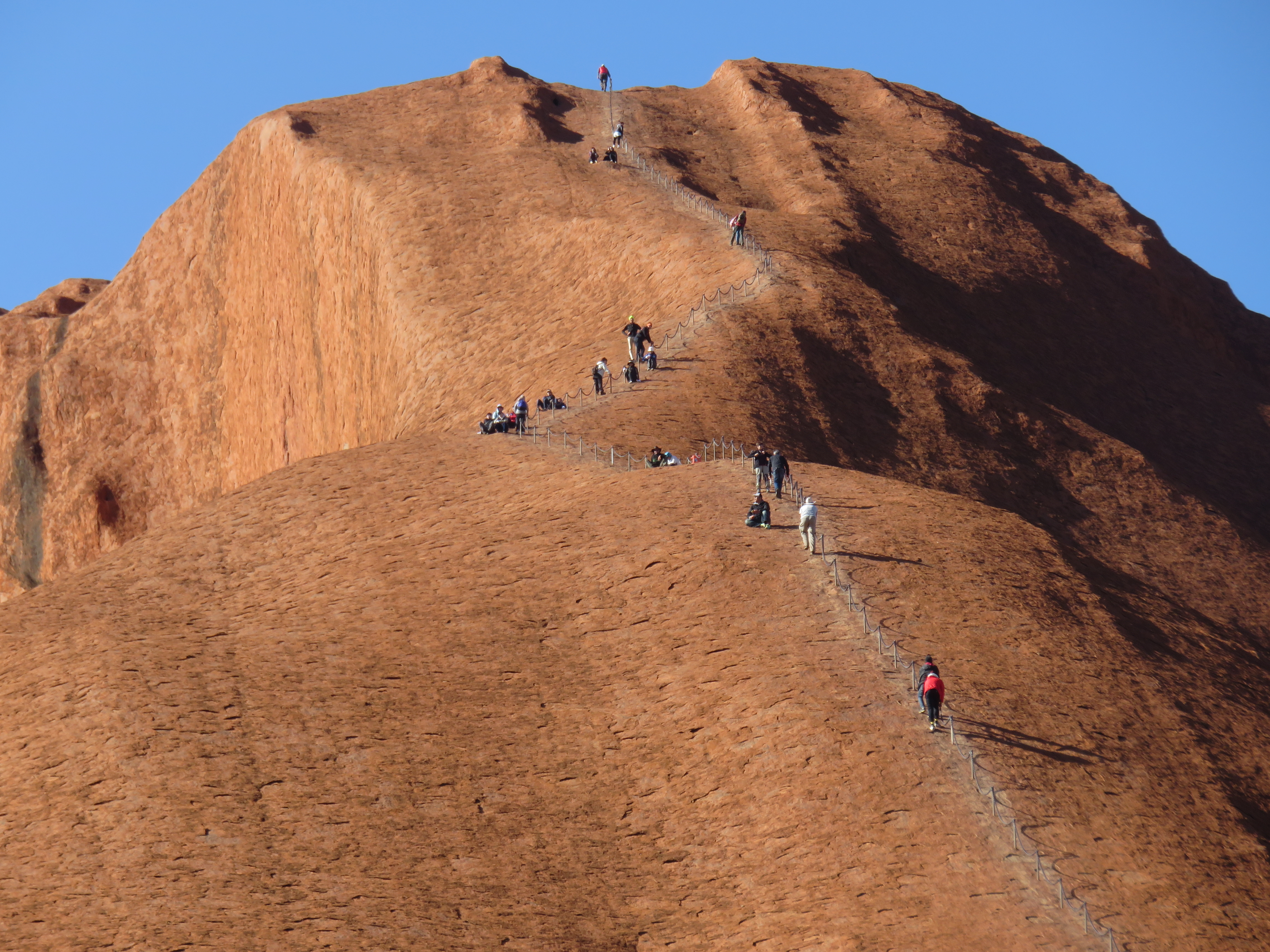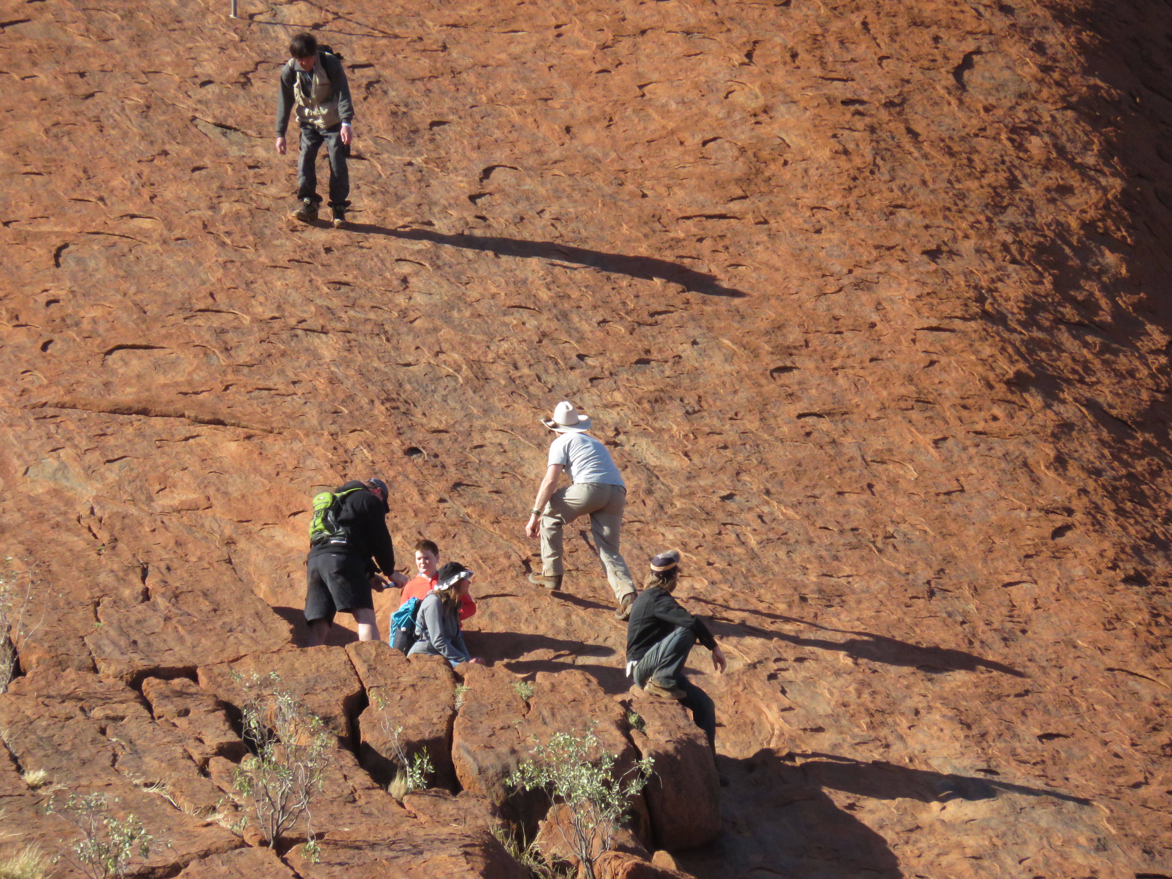 Sure enough, upon returning to the carpark, the climb had indeed been reopened and pedestrian traffic up the side of the cliff was brisk. I looked up, to where I could vaguely see the termination of the chain guide rail. There was nothing else for it, I stripped off my layers, the sun finally making its power felt, leaving but a thin cotton t-shirt emblazoned with ‘ULURU’, as if I needed reminding, as I headed for the tumble of boulders that made up the foothills. Bec wisely decided to stay at ground level, offering to keep an eye on me and produce for me a photographic record of my venture.