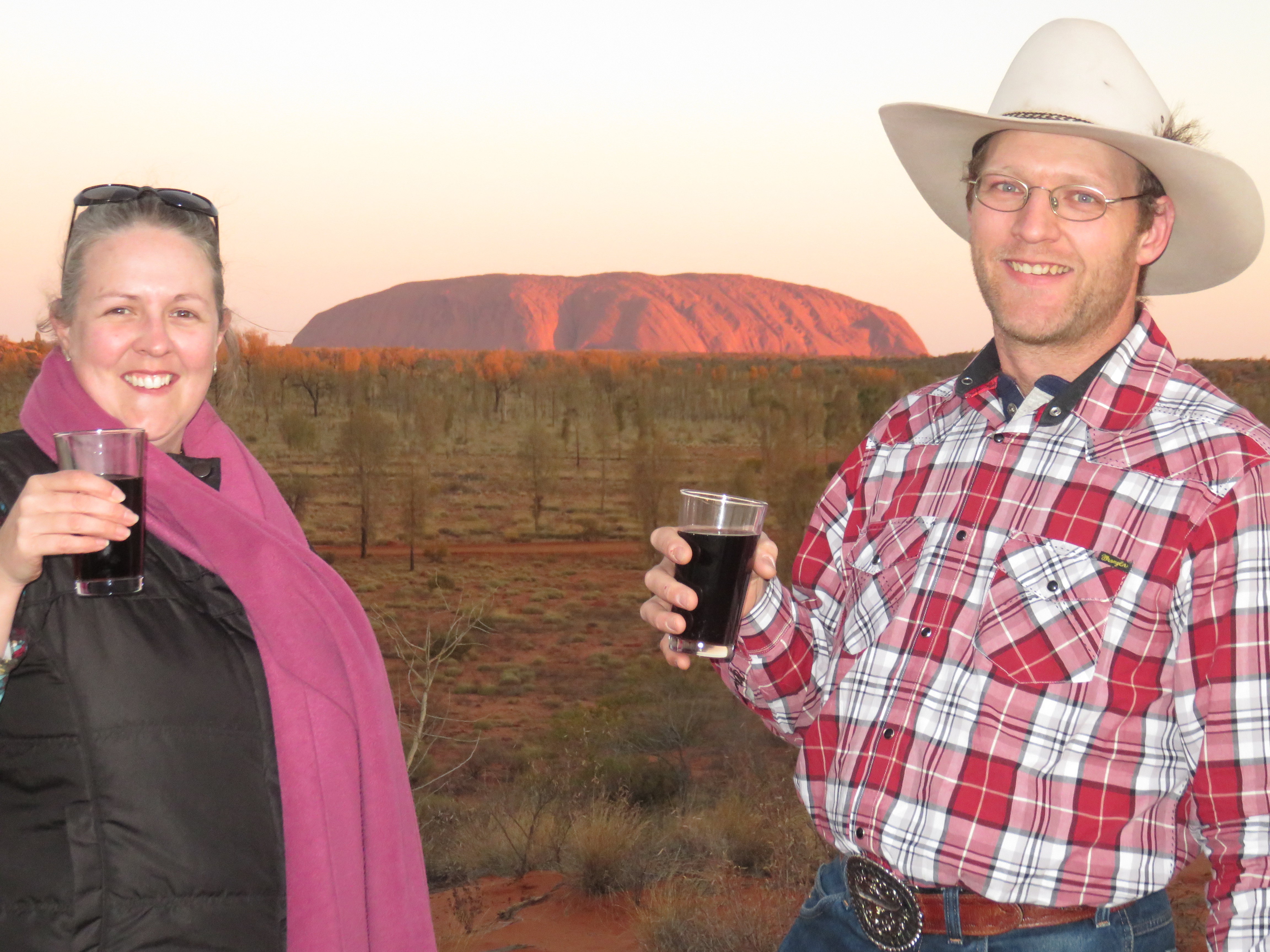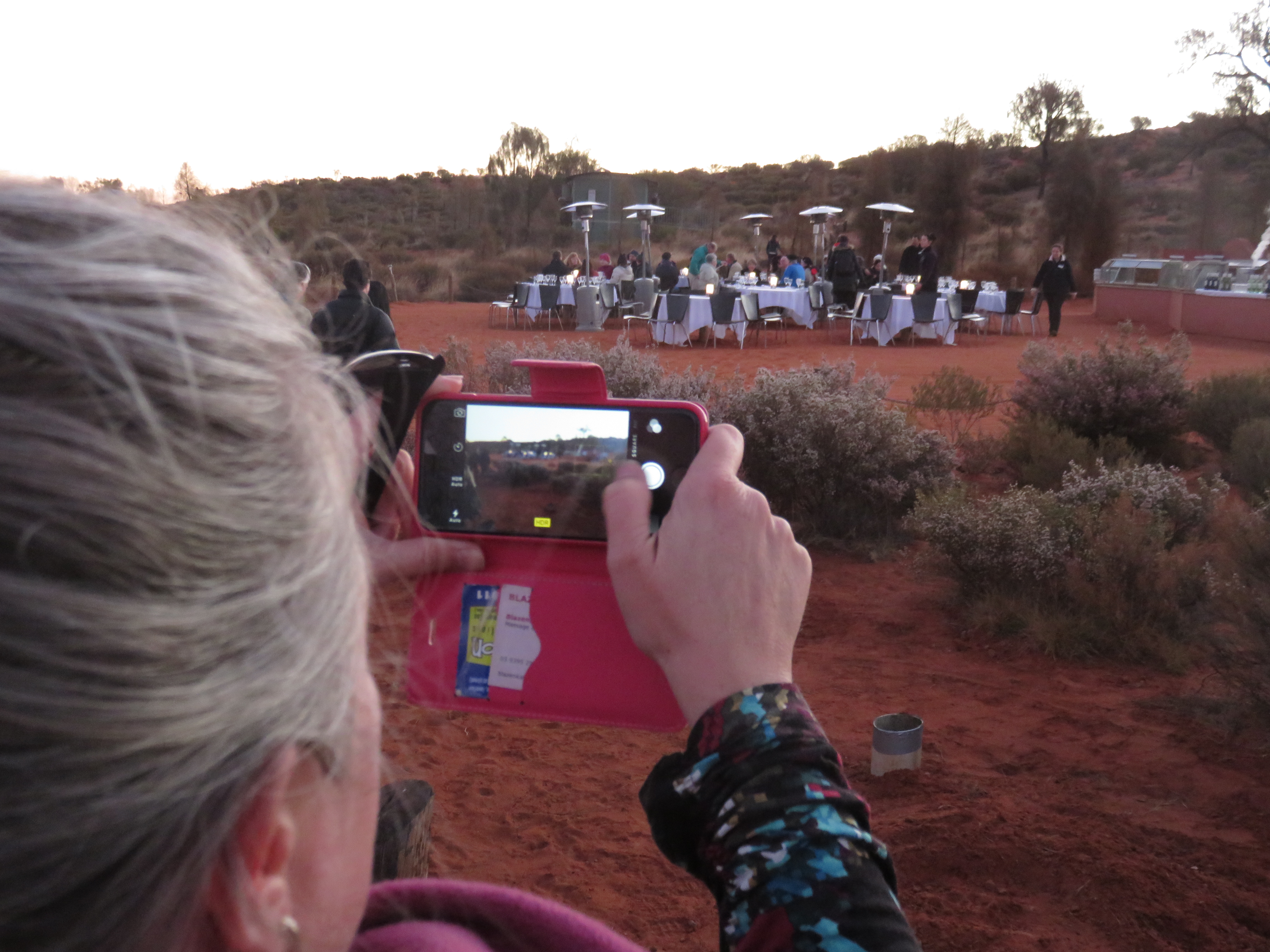 Returning to the van, we had just enough time to pack up a few things in readiness for an early departure tomorrow morning, before getting ourselves ready for a night out on the town. We are heading off for the ‘Sounds Of Silence’ dinner, Yularas version of a theatre restaurant. Picked up by coach, we were driven out to a non-descript sand dune in enough time to witness the sun flailing through the final degrees of its daily sweep, all the while, the ever changing colours of Uluru acting out the first act of the show. With exotic canapés and glasses of effervescent, golden sparkling wine in hand, the show had begun, as couples and groups all shouldered and nudged each other, cameras being handed about with gleeful abandon to all and sundry in an effort to get that singularly perfect portrait against the background of ‘The Rock’. We got ours, amongst much giggling from Bec, who had found that 2 glasses of bubbles is maybe a little more than she can handle.