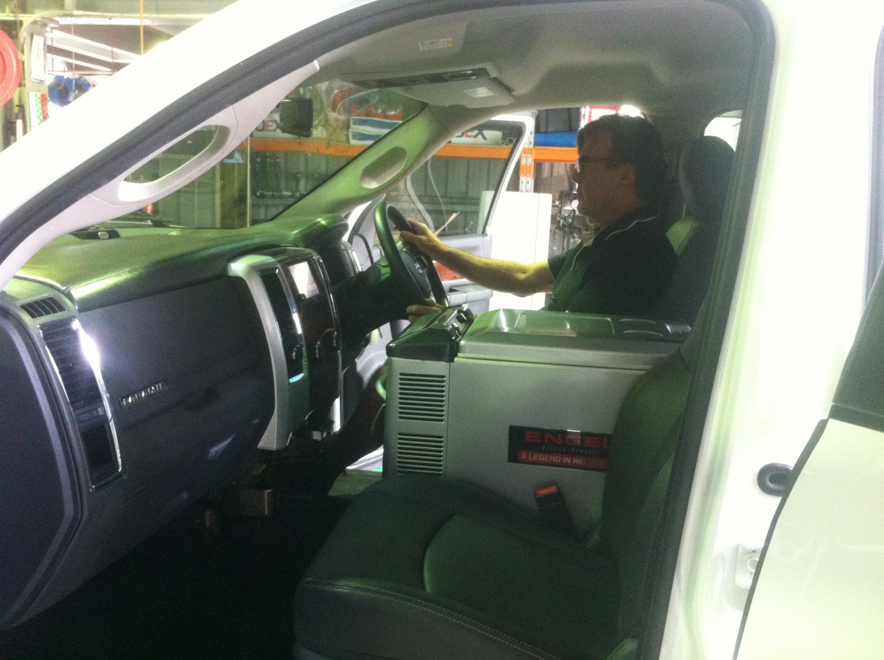 Now, one of the reasons I was after such a large vehicle was so that I could have a drinks fridge mounted right there inside the cabin. I didn’t want it mounted way back out in the tub, where it would be exposed to the weather and any nefarious sorts that might take a liking to it. I also still wanted to be able to use the rear seat for passengers. Apart from that, who wants to stop every time you want a cool drink? So I had our fridge secured right there between the front seats. How great is that?
